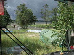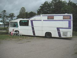 Till slut var vi tvugna att gå in. Men det är mysigt att kura i bussen när regnet smattrar på plåttaket
